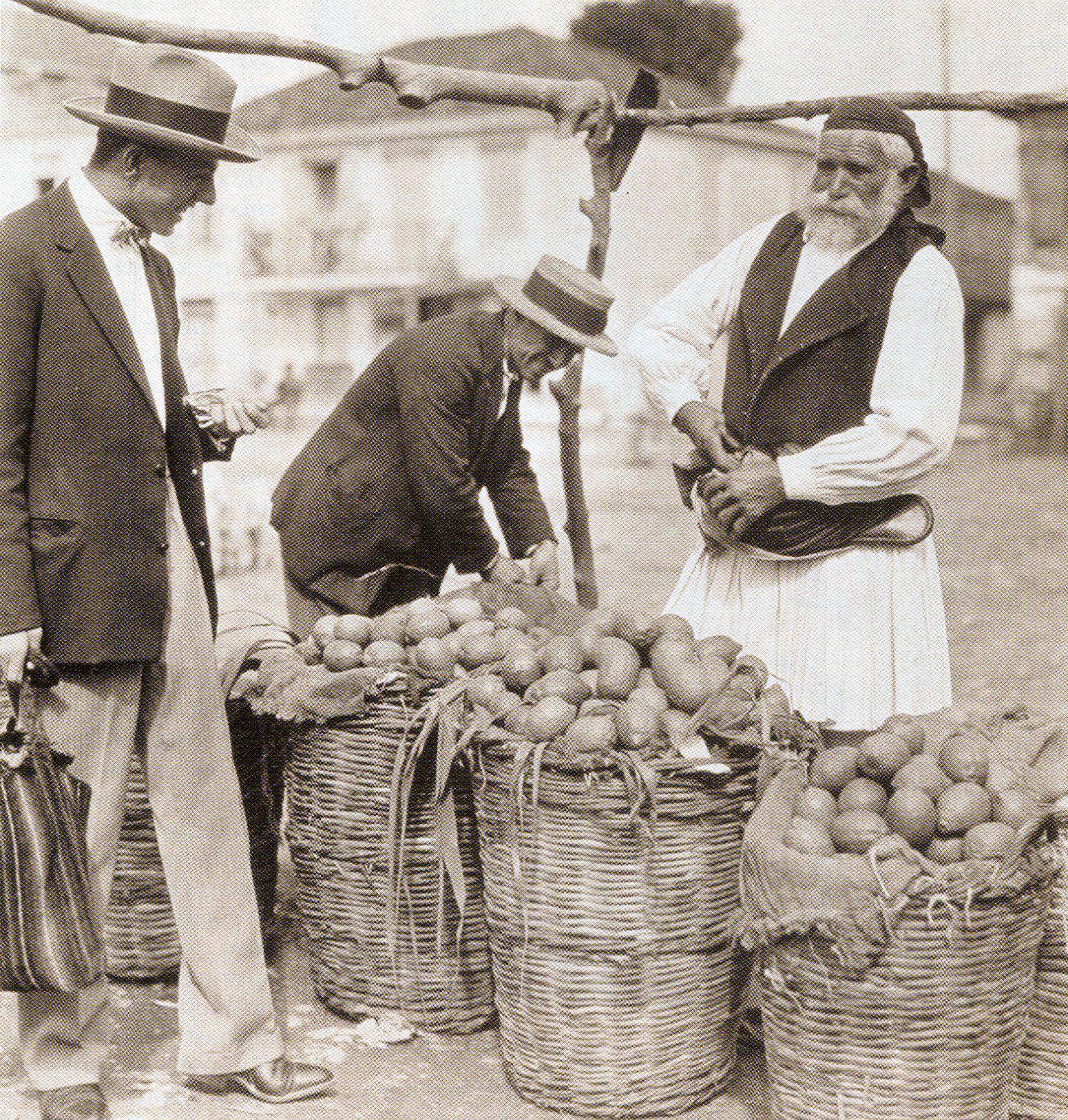 Αρκετοί υποστηρίζουν ότι το φυτό φτάνει για πρώτη φορά στην απελευθερωμένη χώρα το 1828, από τον Ιωάννη Καποδίστρια, δημιουργώντας μάλιστα έναν «εθνικό μύθο που θέλει τον πρώτο κυβερνήτη της χώρας όταν συναντά ανυπέρβλητα στη προώθηση καλλιέργειά της, αφού ο κόσμος δεν την τρώει πιστεύοντας πως θα …δηλητηριαστεί από το άγνωστο «φράγκικο» φυτό, να «φυλακίζει» τις αποθήκες φύλαξής της.